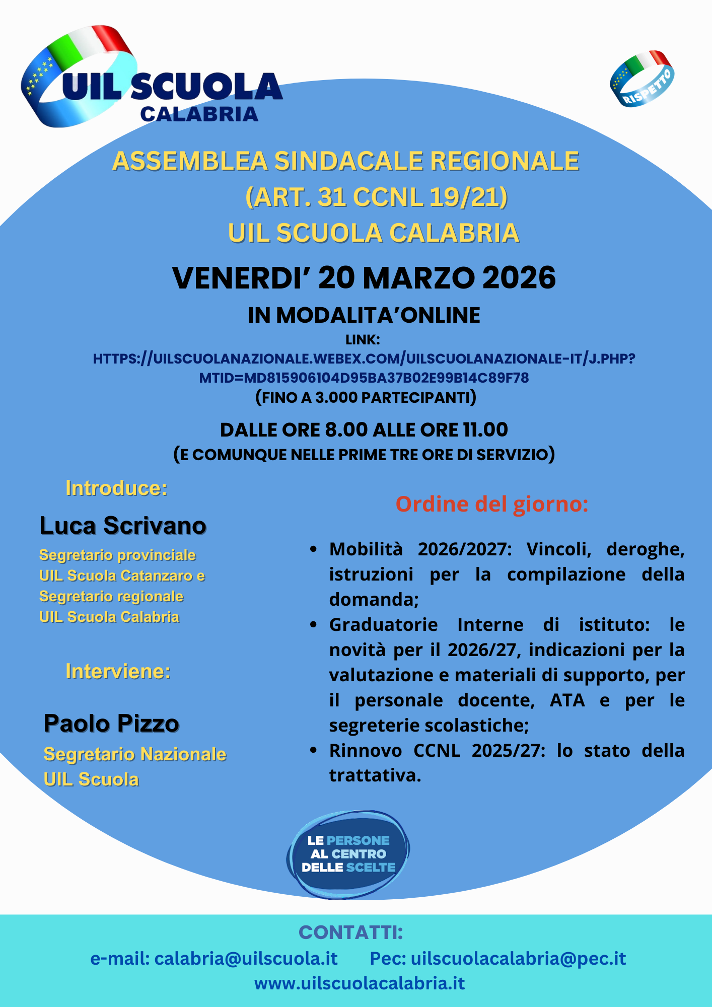 Si informa che il giorno 20 marzo 2026 si terrà l’Assemblea Sindacale Regionale della UIL Scuola Calabria